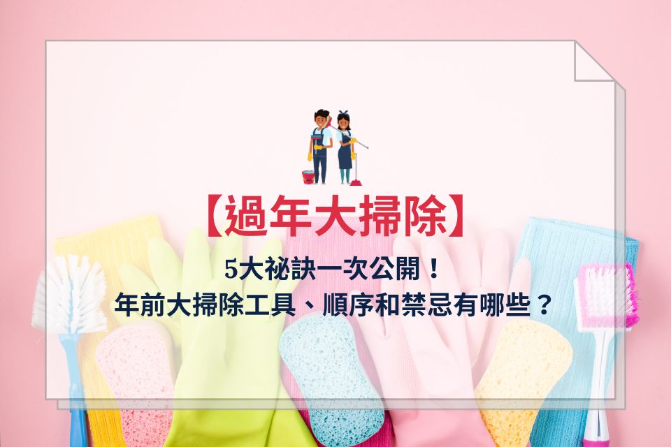 過年大掃除是台灣重要習俗,象徵著除舊佈新,年底大掃除讓家中煥然一新,過年前大掃除也將霉運一掃而空,迎接新年到來。大掃除日期最好選在除夕前完成,通常大掃除順序是由內而外進行更有效率。建議善用吸塵器、拖把、抹布等大掃除工具,也可考慮找清潔員,大掃除費用